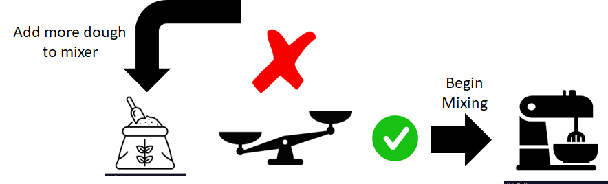 The first part of dough making process involves mixing a large batch of flour and water in a mixer. The process is a small feedback system. A set amount of flour is dumped into the mixer, the mixer is weighed, and if more flour is required, more is added. The process is then repeated for adding the water.